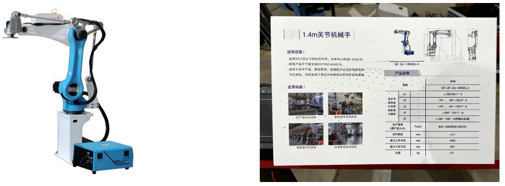 Arm span of 140cm, load of 10KG, using independently developed robot control algorithm to achieve linkage control of various axes. Targeting the feeding characteristics of the stamping industry, the motion trajectory is automatically generated, with smooth and efficient actions and an efficiency of 15 times/min.
